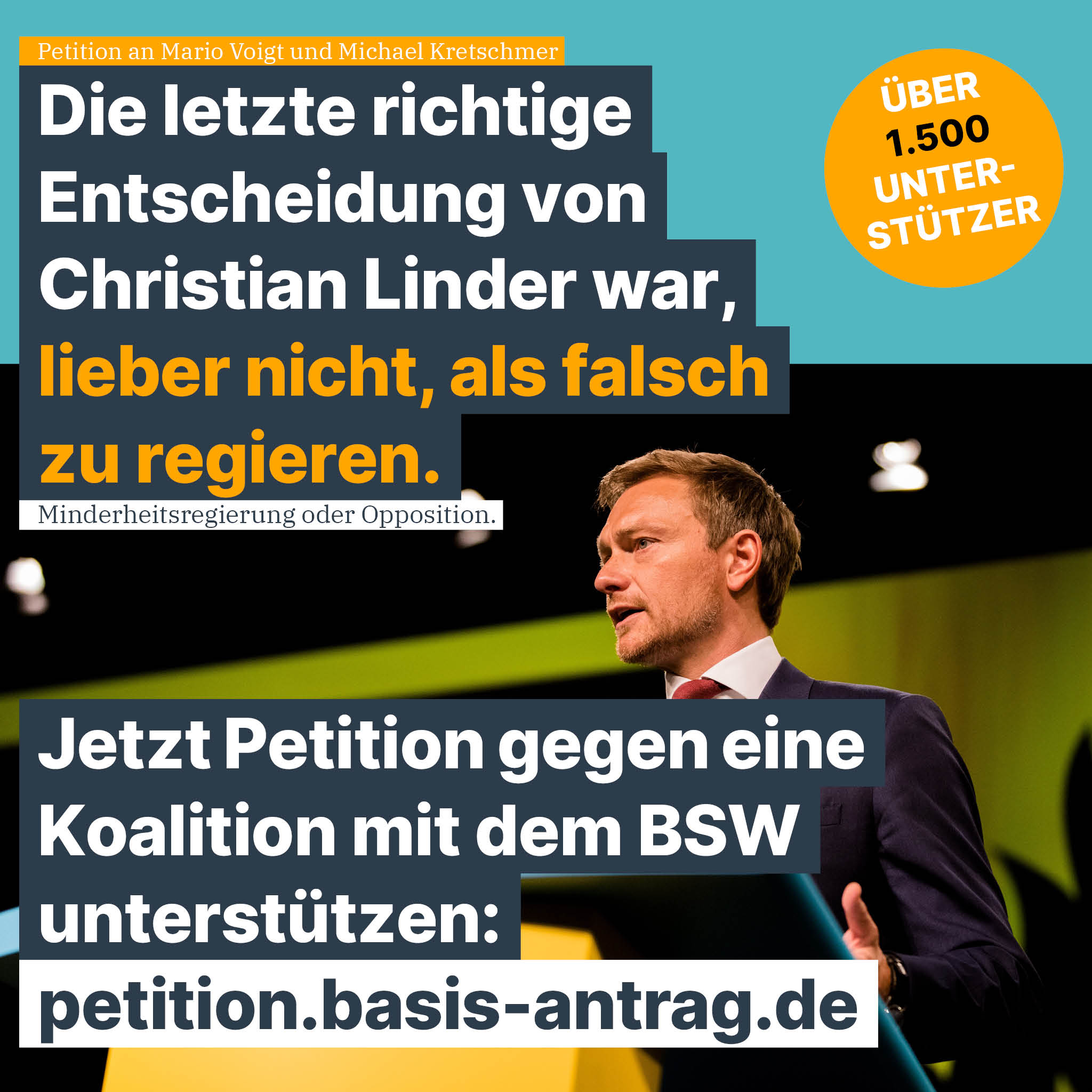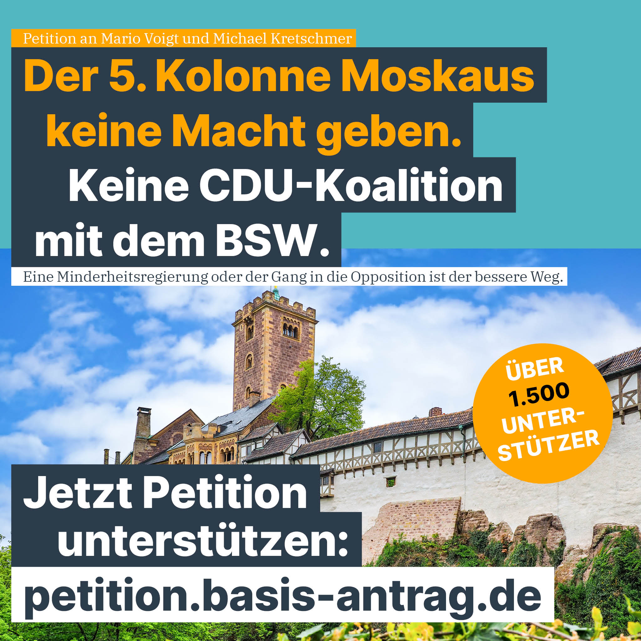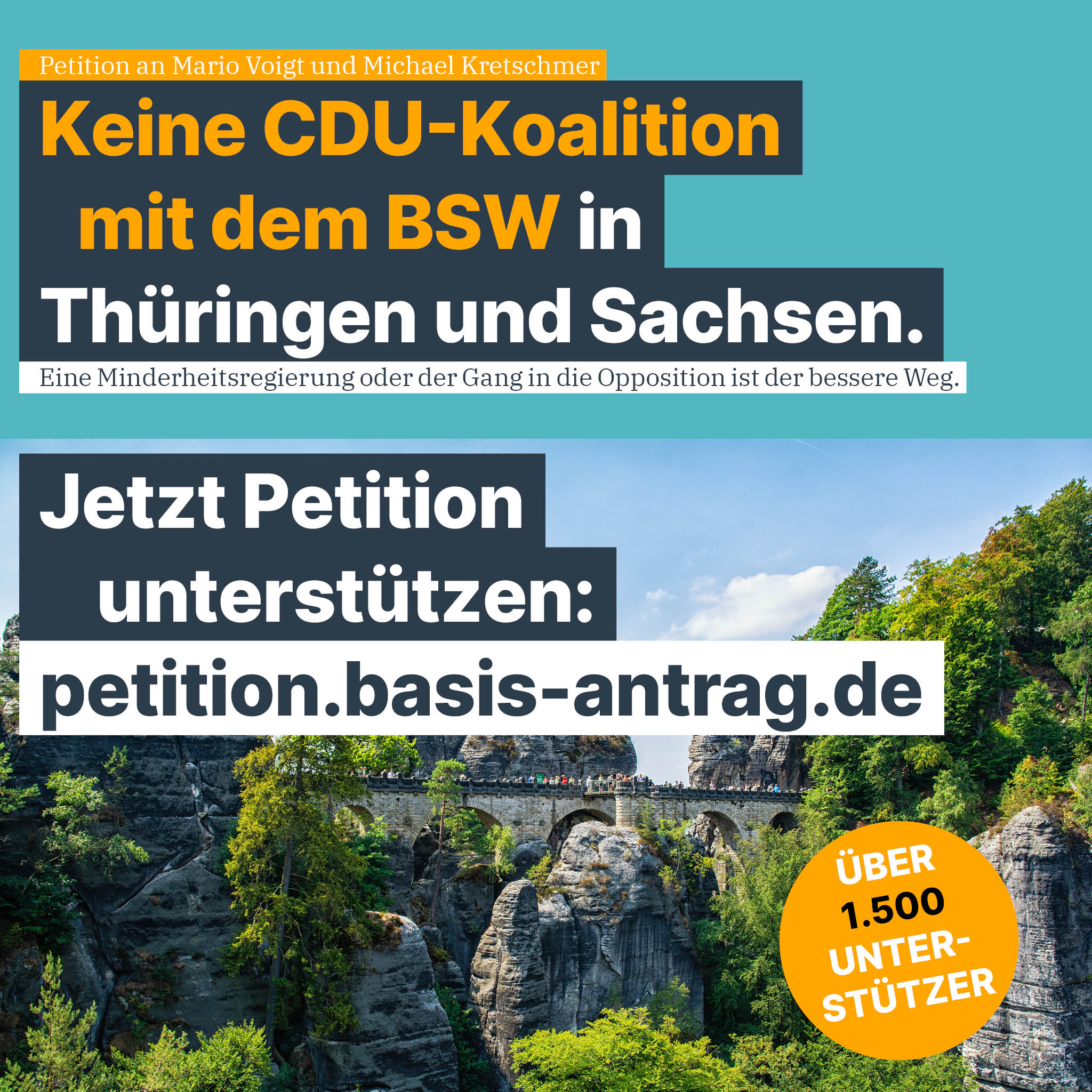 Wir haben bereits über 1.500 Unterstützer, aber wir brauchen noch mehr, um den Druck aufrechtzuerhalten. Jede Stimme und jede Weiterverbreitung zählt, um der CDU zu zeigen, dass eine Koalition mit dem BSW nicht der richtige Weg ist. Minderheitsregierung oder Opposition – das ist die Alternative, die wir fordern!